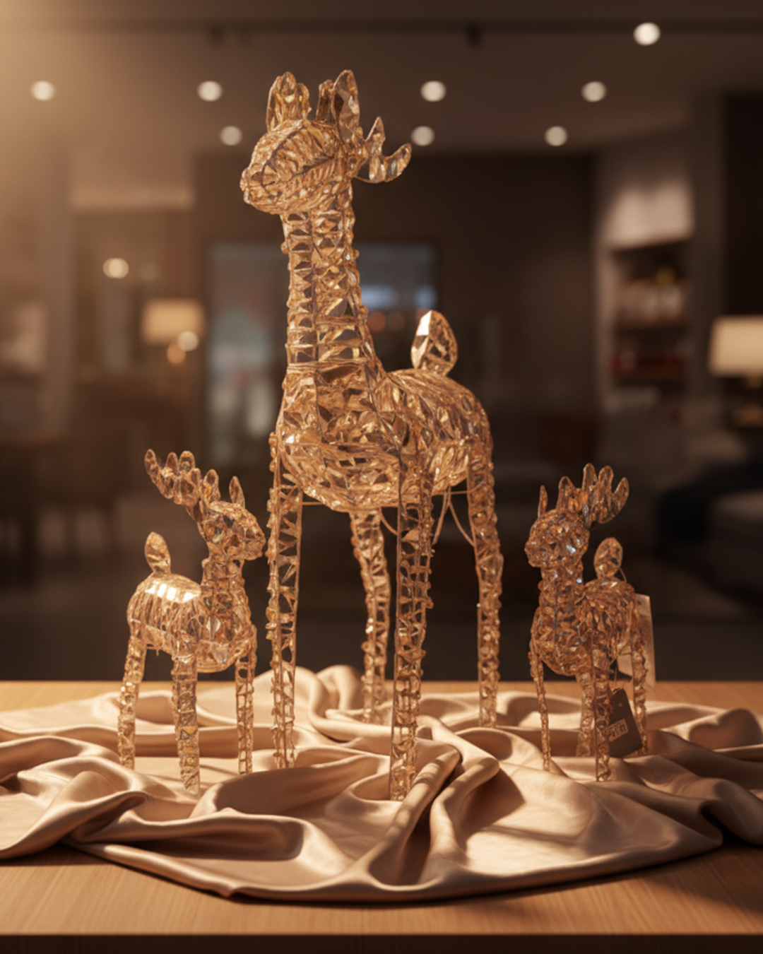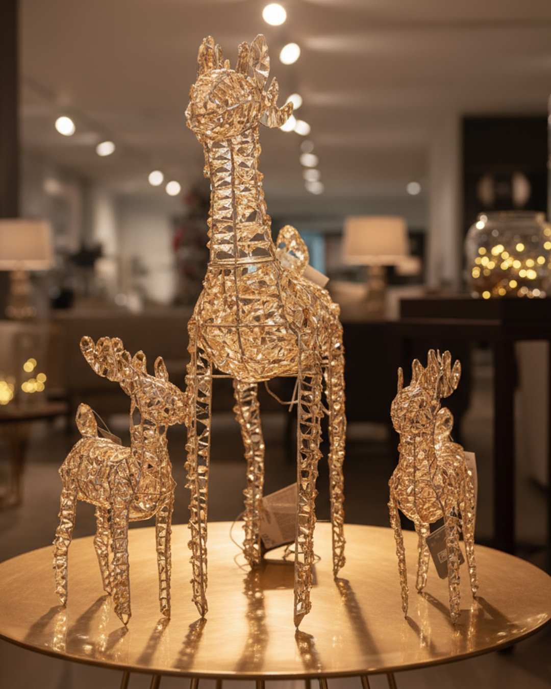 Introduce instant sophistication and shimmer with this trio of elegant reindeer figures. Crafted with a delicate, woven crystalline or heavily beaded effect in a brilliant metallic gold finish, these graceful figures reflect surrounding lights beautifully, ideal for a glamorous centerpiece.