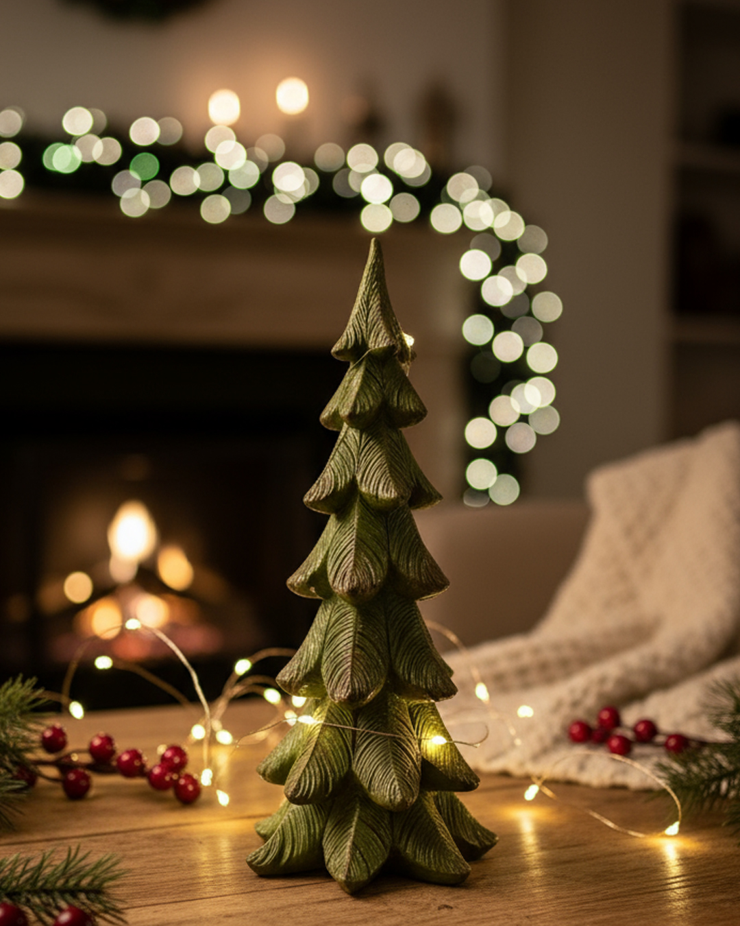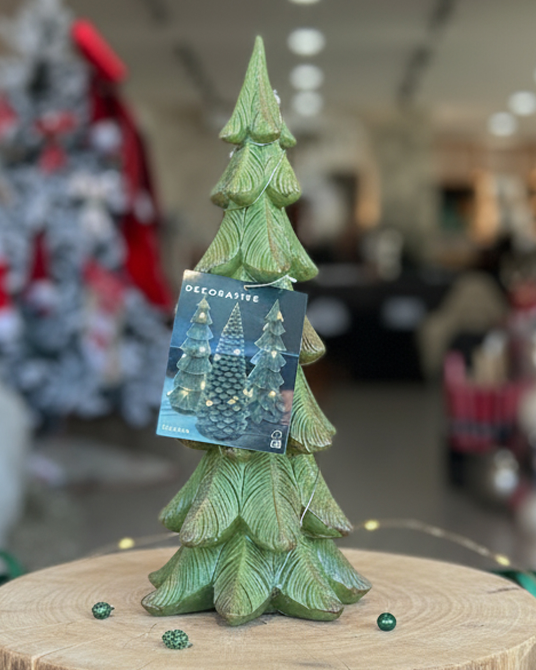 A set of three assorted styles (3ASS) of 30cm green Christmas trees, pre-lit with bright LED lights. Ideal for grouping together on a mantel or used individually across shelving units to tie your décor together.